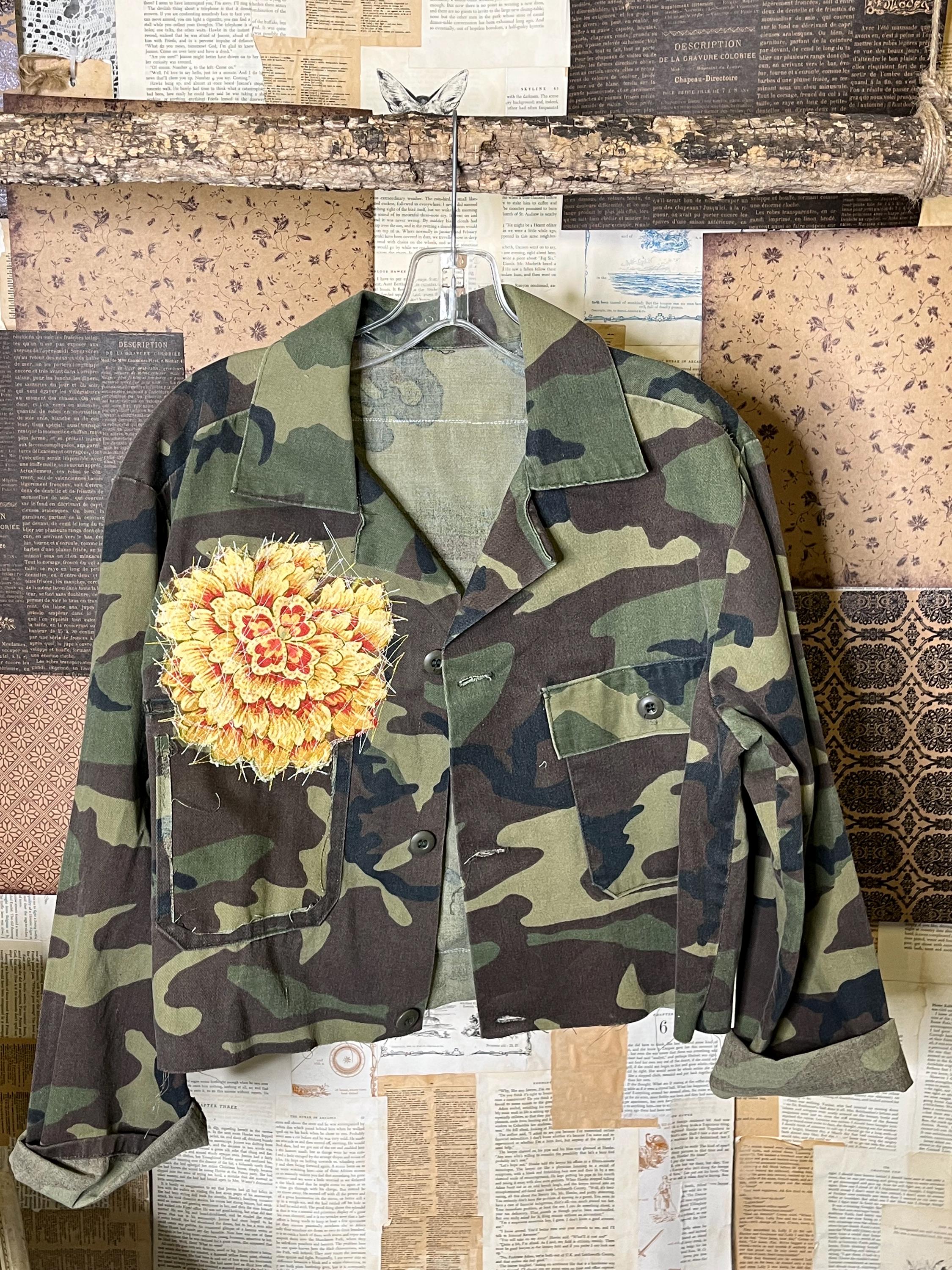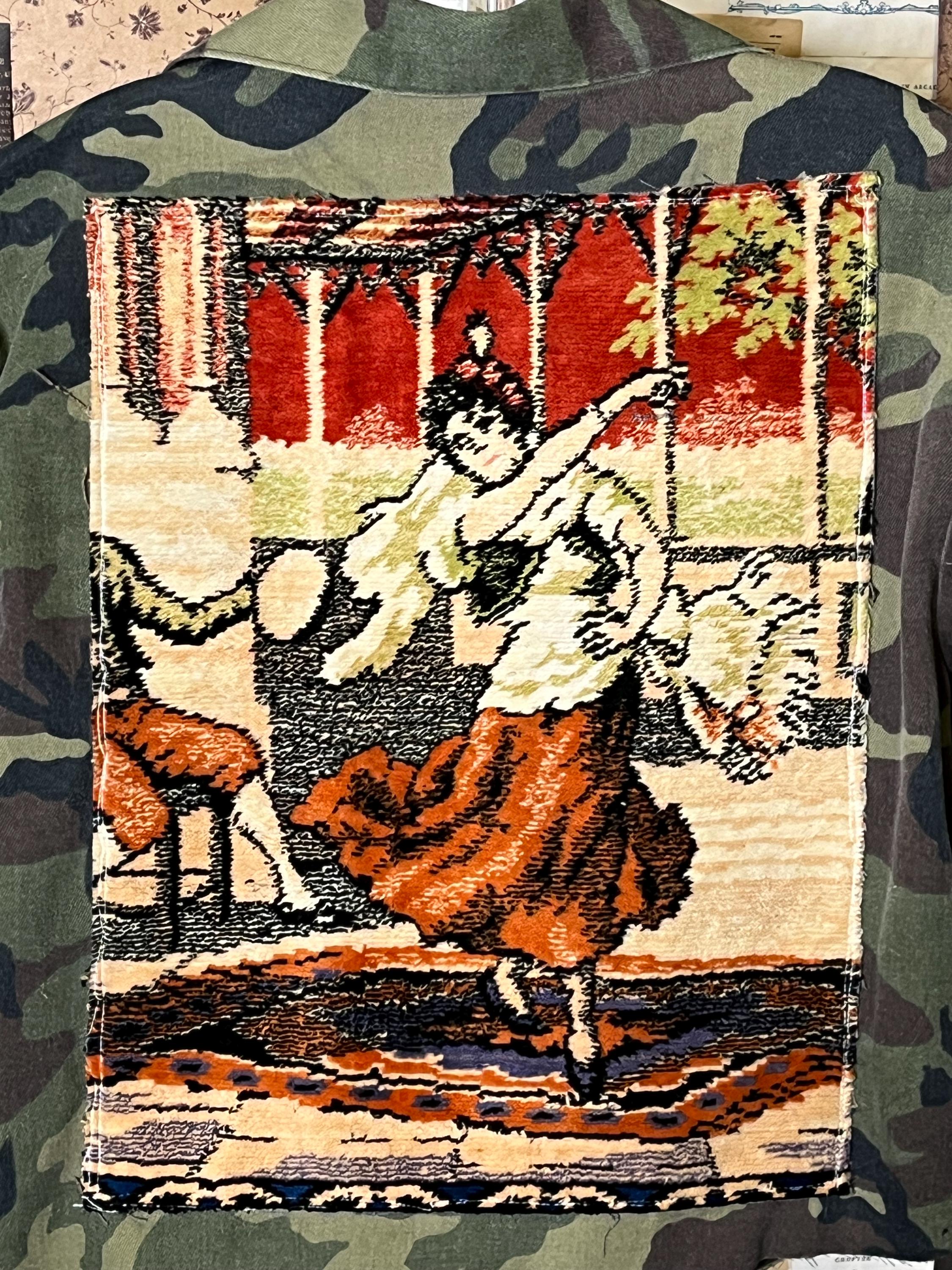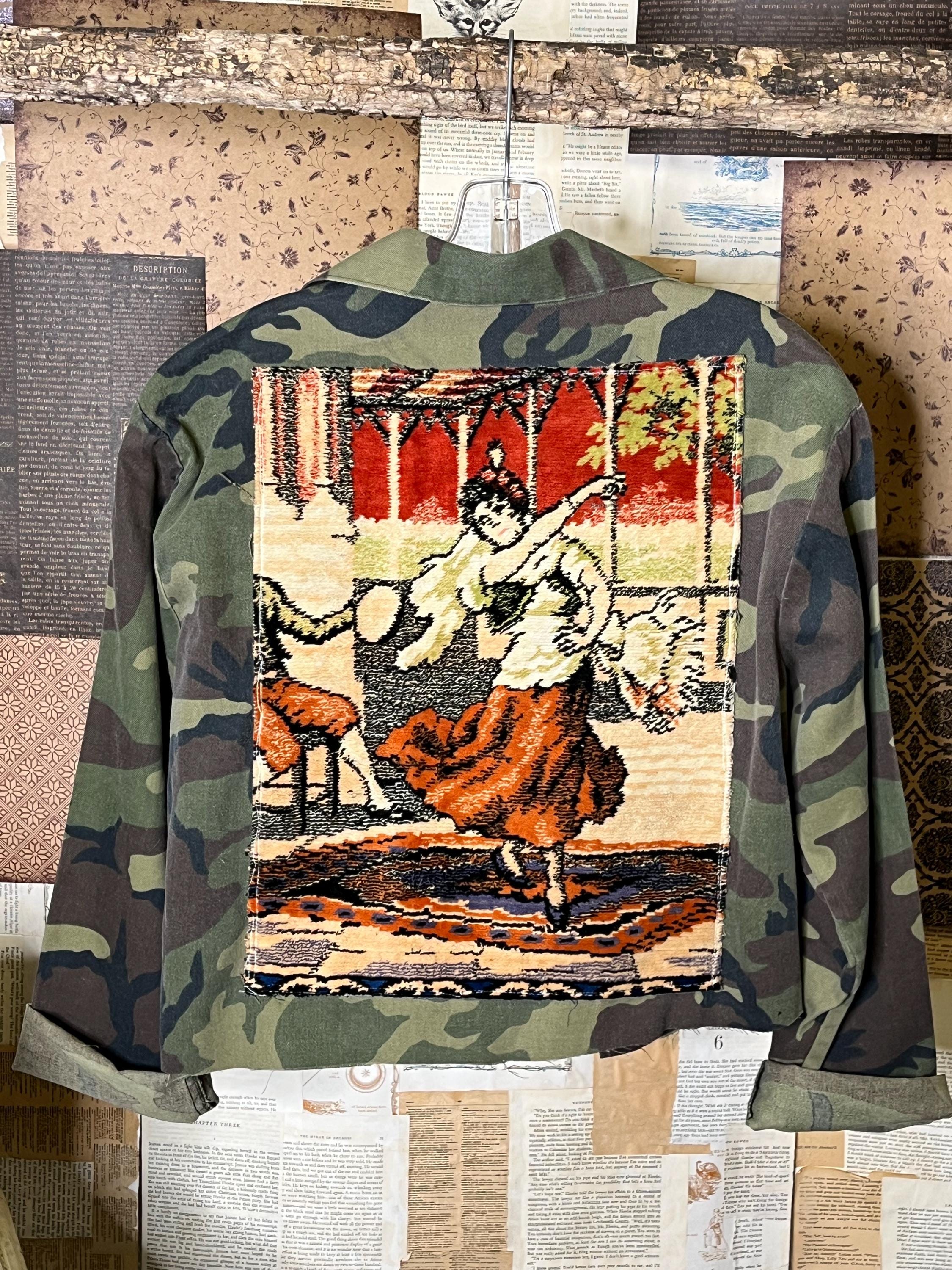 One-of-a-kind upcycled camo jacket, thoughtfully crafted using upcycled vintage fabrics and coordinating cotton textiles.