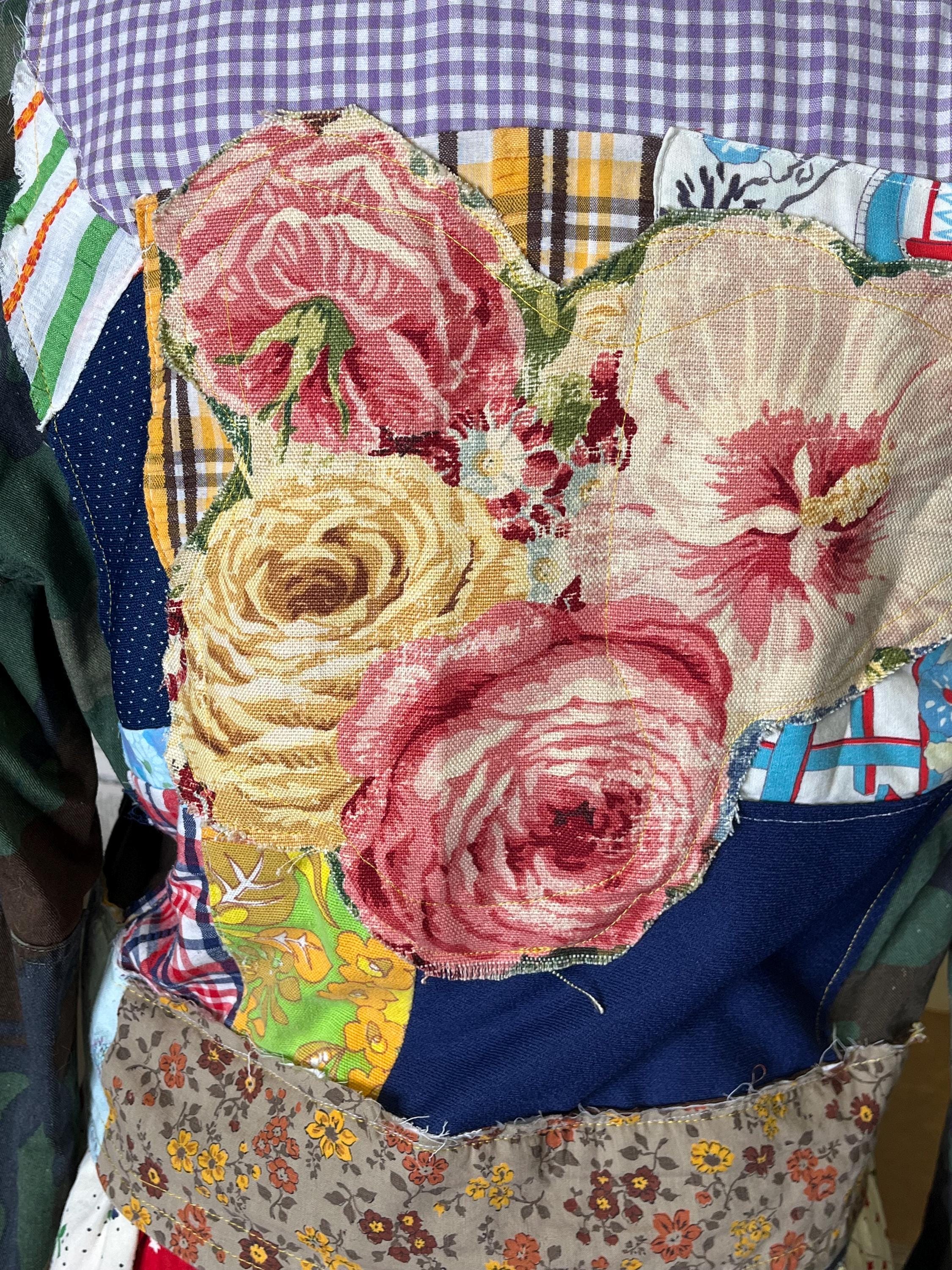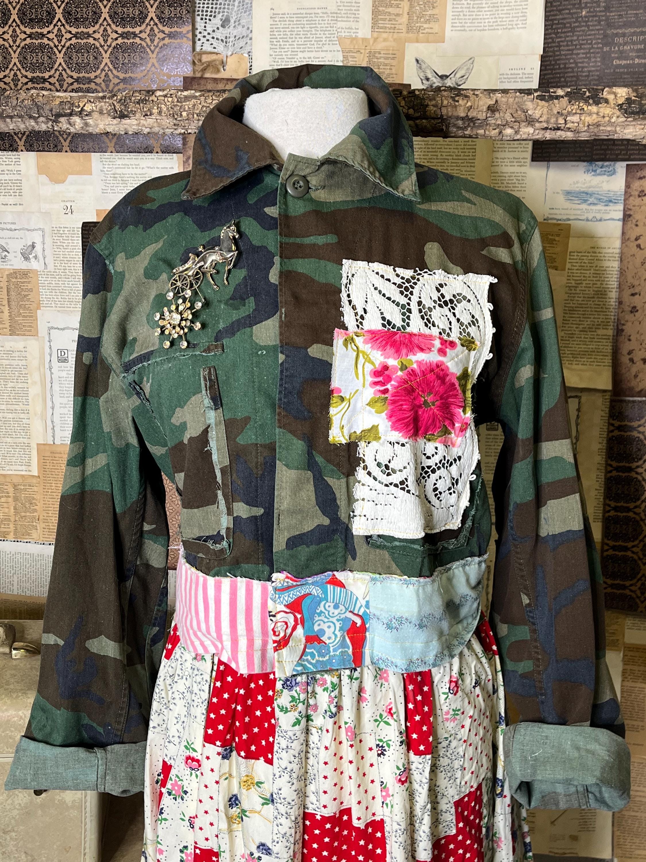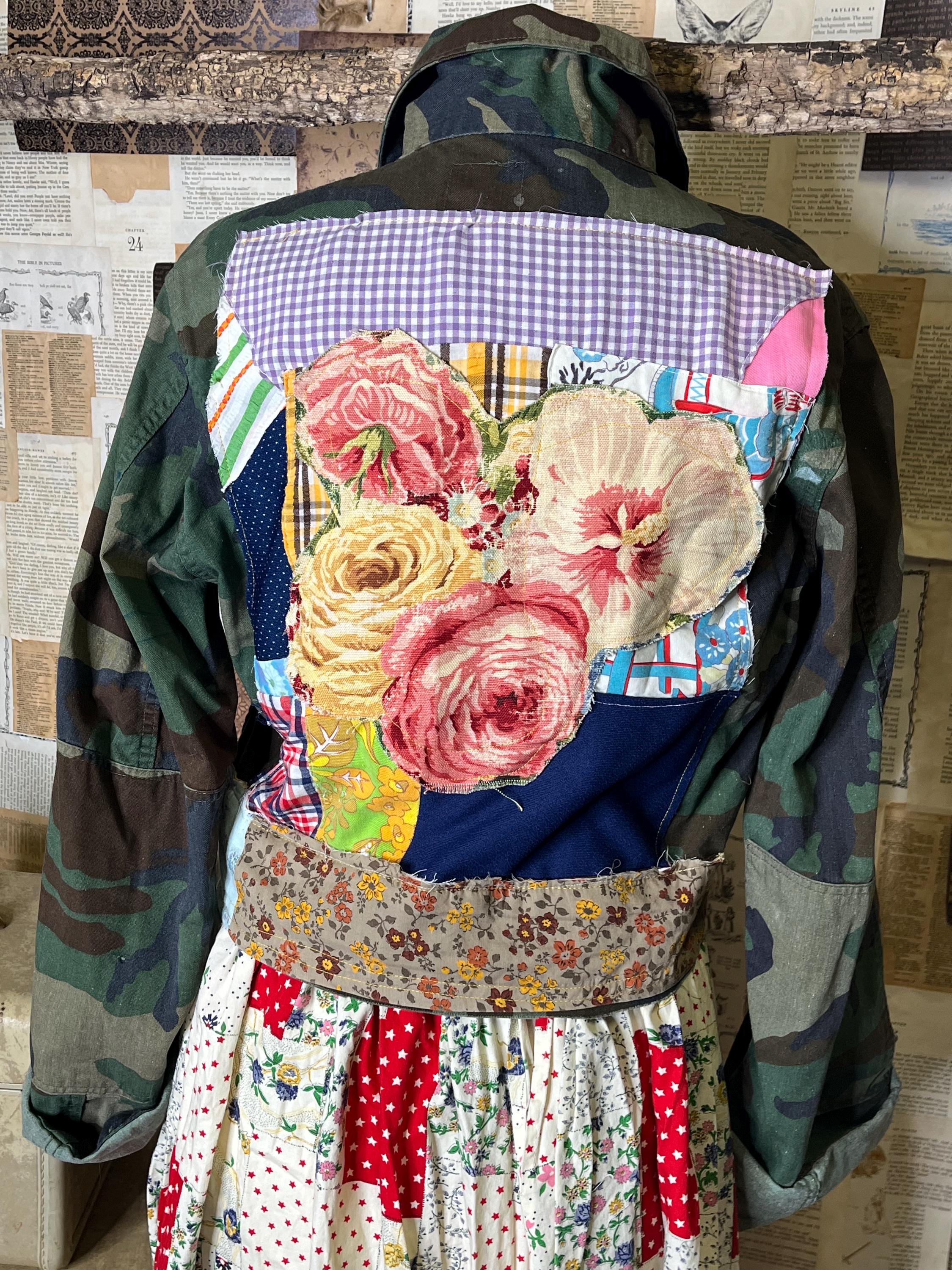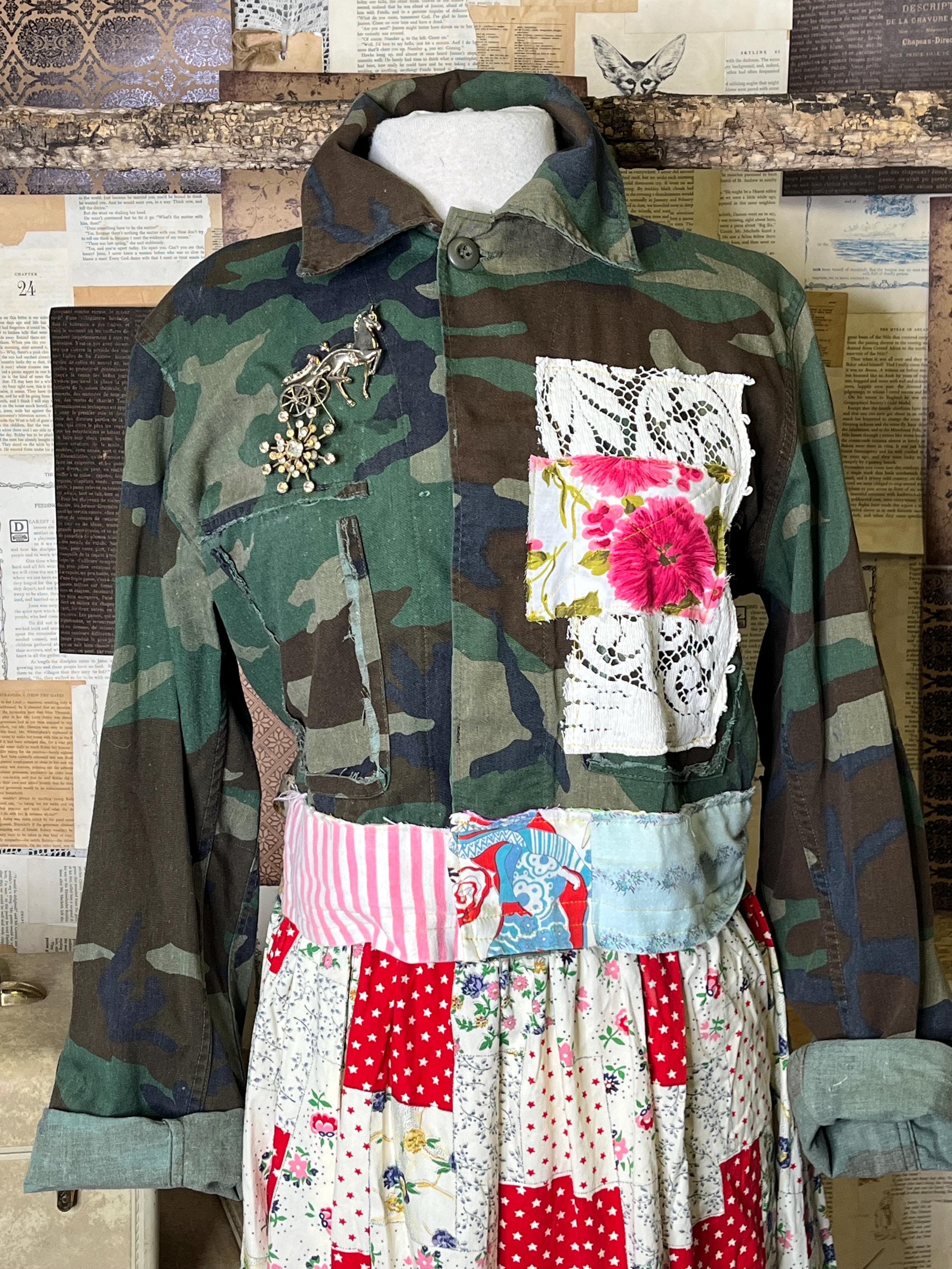 One-of-a-kind upcycled camo jacket, thoughtfully crafted using upcycled vintage fabrics and coordinating cotton textiles. (Brooches not included)