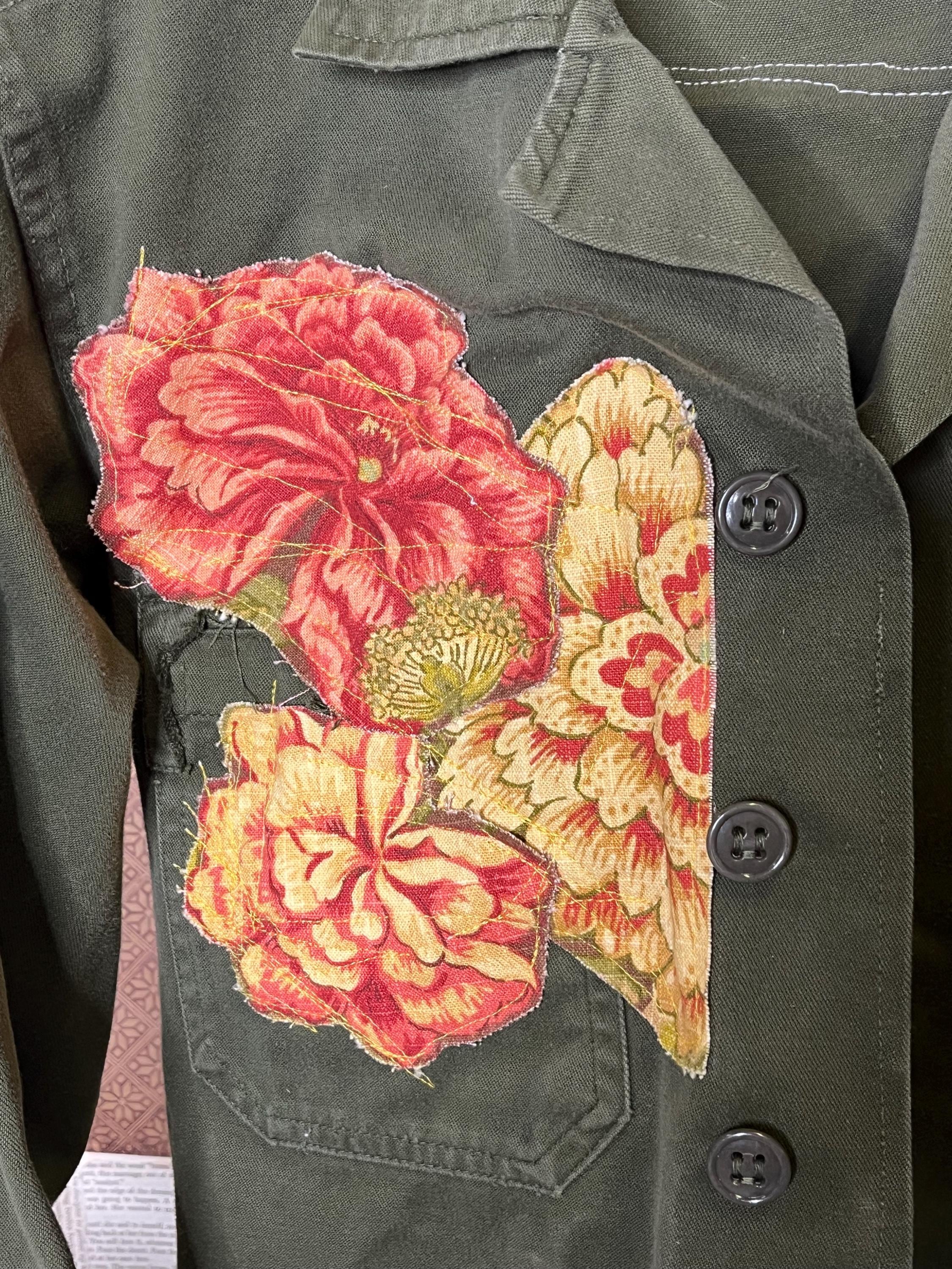 One-of-a-kind upcycled camo jacket, thoughtfully crafted using upcycled vintage fabrics and coordinating cotton textiles.